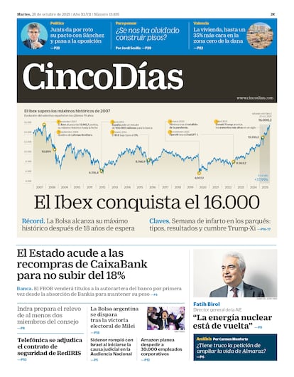 28-10-2025. El índice selectivo de la Bolsa española, el Ibex 35, logra recuperar sus niveles máximos y superarlos tras 18 años, y consigue además superar el billón de euros de capitalización. El hito es más un éxito de las grandes empresas cotizadas, que tienen dos tercios de su negocio fuera de España, que de la propia economía del país.