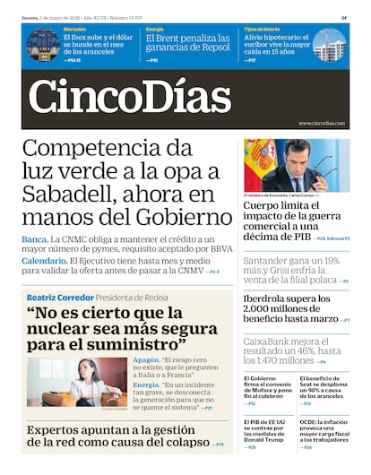 1-5-2025. Competencia autoriza la oferta pública de adquisición de acciones de Sabadell por parte de BBVA con condiciones sobre la cuota de crédito a las pequeñas empresas. La operación queda pendiente del plácet del Gobierno antes de someterse al examen de la Comisión del Mercado de Valores.