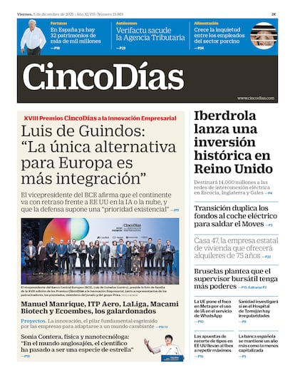 5-12-2025. En la XVIII edición de los Premios CincoDías a la Innovación Empresarial, Luis de Guindos, vicepresidente del Banco Central Europeo, afirma que “la única alternativa para Europa es más integración”. Una receta que considera clave ante la guerra arancelaria, el riesgo geopolítico y el retraso tecnológico frente a EE UU.