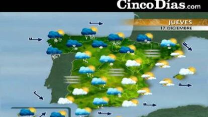 Para hoy jueves, se prevé que suban las temperaturas de forma generalizada en toda la península. Las lluvias más intensas se producirán en las islas occidentales del archipiélago canario. Habrá precipitaciones ocasionales en el oeste y el norte de la Península Ibérica, con nieve en cotas altas. Nevará entre los 800 y los 1.200 metros en el norte, en torno a los 1.500 metros en el centro y en torno a los 1.800 metros en el sur. Las condiciones meteorológicas serán más estables hacia la zona oriental peninsular y en el archipiélago balear. El viento de componente oeste soplará con intensidad en la vertiente occidental de la Península.La llegada de una nueva perturbación desde el Atlántico dejará el viernes tiempo complicado en la mitad occidental peninsular. Comenzará el día con lluvias moderadas en Extremadura y el oeste de Andalucía. A lo largo de la jornada las precipitaciones se intensificarán en Galicia, el Cantábrico occidental y la Comunidad de Castilla y León, pero también llegarán, de forma no tan intensa, al resto de la Península. Sólo en la vertiente mediterránea se librarán de las precipitaciones. La cota de nieve bajará hasta los 400 metros en el País Vasco y el Pirineo y 800-1.000 en el Cantábrico occidental. En el resto de la Península la cota de nieve se quedará entre los 1.400 y los 2.000 metros. Las temperaturas bajarán en el noroeste peninsular y se mantendrán estables en el resto.