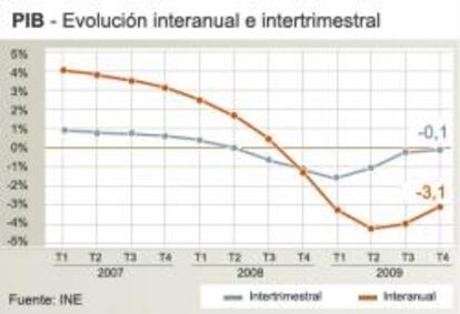 Las cifras de la contabilidad nacional avanzadas hoy por el Instituto Nacional de Estadística (INE), que coinciden con las previsiones del Banco de España, confirman que España no salió de la recesión en el cuarto trimestre de 2009 al caer el PIB un 0,1%, de modo que la economía española acumula siete trimestres consecutivos de caidas. En tasa interanual, el PIB bajó un 3,1% y el conjunto del año, un 3,6%.