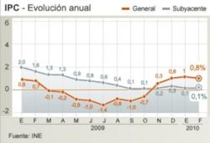 El Índice de Precios al Consumo (IPC) bajó dos décimas en el mes de febrero en relación al mes anterior, lo que permitió que la tasa interanual se situara en el 0,8%, dos décimas inferior a la de enero, según informó hoy el Instituto Nacional de Estadística (INE).