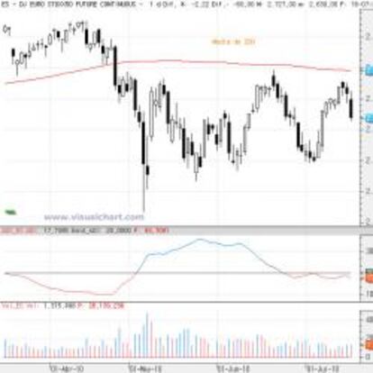 Y si no vean el gráfico del futuro del Euro Stoxx. Desde el mes de mayo hemos entrado en un movimiento lateral total. Dentro del mismo, las idas y las venidas son muy difíciles de seguir, pero al final siempre estamos en el mismo sitio. La media de 200 es la resistencia clave.