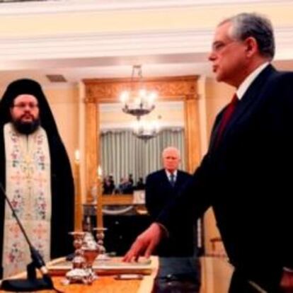 Hoy ha prestado juramento el nuevo Gobierno de coalición griego dirigido por Lucas Papademos, quien ha mantenido al frente del ministerio de Finanzas al hasta ahora ministro, Evangelos Venizelos.