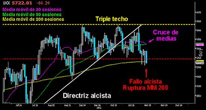 También fracasó estrepitosamente el extenso martillo trazado en el Gentleman inglés. Se dejó un -1,11% hasta alcanzar los 5.722 puntos. A doce de los últimos mínimos que dibujó el mencionado martillo. Traza una sólida vela sin apenas sombras que cierra por debajo de la media móvil de las 200 sesiones. Por su parte la media de de 20 sesiones cruza ya a la baja la de 50. El Footsie a punto de ser derrotado. O responden los toros o el triple techo será confirmado con una proyección que le manda doscientos puntos para abajo. La situación es muy delicada tras el fracaso de ayer en el selectivo británico.