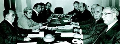 Tras la muerte de Franco representó a Galicia en la Comisión de los Diez que negoció la transición con el Gobierno de Adolfo Suárez (en la fotografía, Paz-Andrade es el tercero de la fila de la derecha; enfrente tiene a Santiago Carrillo, Marcelino Camacho, Nicolás Redondo, Felipe González y Jordi Pujol).
