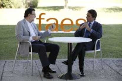 El presidente del Gobierno y el expresidente han ocupado dos sillas situadas en torno a una pequeña mesa y delante del logotipo de la fundación que preside Aznar.