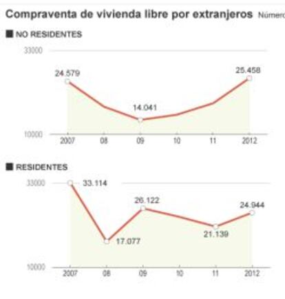 Así, durante el primer semestre del año pasado se vendieron 24.552 casas a extranjeros, según las cifras facilitadas por el Consejo General del Notariado. Este volumen significa un aumento del 13,6% respecto a idéntico periodo del año anterior, pero tiene matices. De esas transacciones, más de la mitad, el 53,8%, correspondió a las operaciones hechas por no residentes (que sumaron un total de 13.233 adquisiciones, un 31,5% más anual), que ya compran más pisos que los extranjeros que viven en España, algo que solo había ocurrido en 2008, cuando estalló la crisis; y volvió a pasar tímidamente en 2012, momento en el que empezó a recuperarse la inversión en vivienda por parte de los foráneos.