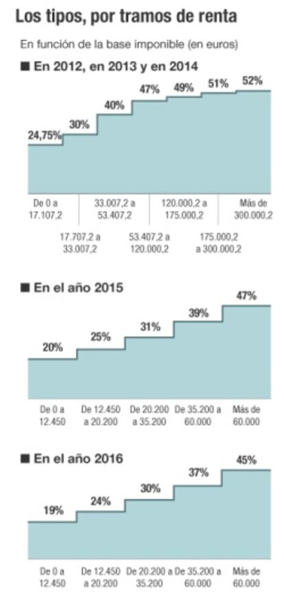 Este cambio tributario implica un perjuicio para la mayoría de contribuyentes, sin embargo, queda compensado sobradamente por la rebaja de tipos y tramos en el IRPF. Todos los declarantes pagarán menos por el impuesto sobre la renta en 2015 y 2016 de lo que tributan ahora. Esto es así porque el Ejecutivo reducirá de siete a cinco el número de tramos. El tipo menor que se sitúa hoy en el 24,75% pasará al 20% en 2015 y al 19% en 2016. El gravamen máximo del 52%, que aplican aquellos que tienen rentas superiores a 300.000 euros, se reducirá al 45% en dos años y se empezará a aplicar a partir de rentas superiores a 60.000 euros.