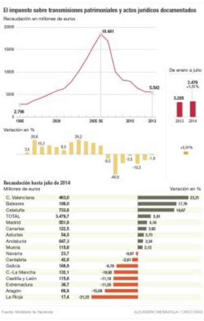 Ambos tributos, cuya recaudación está cedida a las comunidades autónomas, pasaron de aportar 5.000 millones en 1999 a 18.000 millones en 2006. Nunca antes los Ejecutivos autonómicos habían registrado un incremento de ingresos de tal calibre. El espejismo se empezó a romper en 2007, cuando la recaudación del impuesto sobre transmisiones patrimoniales y actos jurídicos documentados descendió por primera vez un 8,5%.
