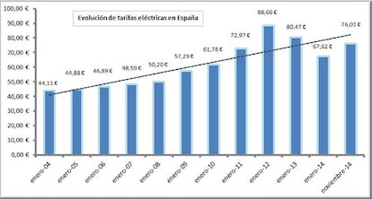 De este análisis comparativo "Evolución de las tarifas eléctricas entre 1993 y 2014" realizado por FACUA-Consumidores en Acción sobre la base de más de 50.000 facturas de viviendas ocupadas con un perfil de usuario medio en España que tiene una potencia contratada de 4,4 Kw y que consume 366 Kwh al mes, se desprende que el usuario medio paga actualmente 382,80 euros más al año que en 2004. En el año 2004 abonábamos de media al mes 44,11 euros frente a los 76,01 euros en noviembre de este año. Y todo ello teniendo en cuenta que en el mes de enero de 2014 la factura mensual descendió a 67,62 euros después de que el Gobierno sustituyese la subasta que fijaba las tarifas por otro sistema. Aún con esta bajada puntual a principios de año, la factura luz ha vuelto a subir llegando a los 76,01 euros del mes de noviembre.