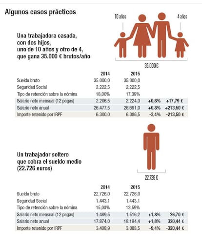 Por ejemplo, un trabajador sin hijos que gane 22.726 euros –el sueldo medio según el INE– sufre hoy un tipo de retención del 15% y su sueldo neto –tras descontar los 1.443 euros por cuotas sociales– suma 17.874 euros al año o 1.489,5 euros al mes. A partir de enero, en la nómina de este empleado el tipo de retención se fijará en el 13,59% y el sueldo anual subirá en 320 euros hasta los 18.194,4 euros al año. El sueldo mensual aumentará en 26,7 euros y quedará en 1.516,2 euros mensuales. Supone un incremento del salario del 1,79%. Si se ve por el lado del pago de impuestos, este contribuyente abonará por IRPF 3.088,46 euros, un 9,4% menos que ahora.