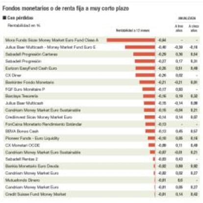 Veintitrés fondos considerados ultraseguros –monetarios y de renta fija a muy corto plazo– registraron pérdidas el año pasado, debido a que los tipos de interés a corto plazo están por los suelos. Los expertos prevén que el número de carteras con números rojos suba en 2015. Mientras, algunas gestoras rebajan las comisiones para tratar de evitar las minusvalías.