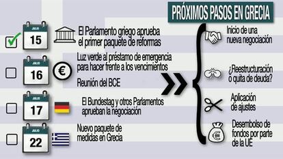 Grecia ha dado un paso para iniciar el proceso del tercer rescate. El Parlamento ha dado luz verde, con 229 votos a favor, 64 en contra y seis abstenciones, el paquete de reformas previo que había exigido el Eurogrupo para comenzar las negociaciones hacia el tercer rescate. ¿Qué puede pasar ahora? Estas son algunas claves:
