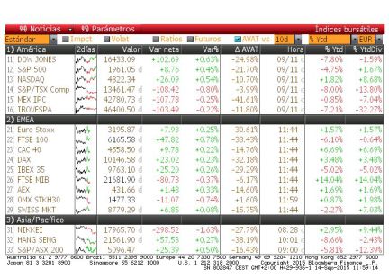 Se impone el rojo: Las perdidas se imponen a uno y otro lado del Atlántico. El Dow Jones cede un 0,48% y el Ibex 35, un 0,27%, solo superado en Europa por el Ftse de Londres, que cae un 0,6%.