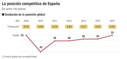 Y son precisamente esas reformas las que ha valorado el Foro Económico Mundial para situar a la economía española como la trigésimo tercera más competitiva del mundo. Una posición que, sin en principio parece que no está acorde con el peso en la economía mundial, refleja una importante mejora volviendo a lo perdido de 2009. Ese ejercicio también ocupó la misma posición y desde esa fecha emprendió una cuesta abajo que le llevó al puesto 42 en 2010, al 36 en 2011 y 2012 y al 35 en 2013 y 2014.