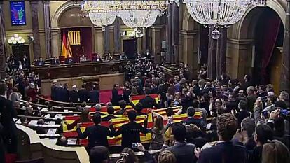 "El Parlamento de Cataluña declara solemnemente el inicio del proceso de creación del Estado catalán independiente en forma de República”. Es uno de los puntos incluidos en la resolución independentista que hoy se ha votado en la cámara legislativa autonómica y que supondrá también el punto de partida de la maquinaria del Estado para frenar la ofensiva soberanista. Junts pel Sí, el partido que integra en su seno a Convergència Democrática de Catalunya (CDC) y Esquerra Republicana de Catalunya (ERC) y la CUP, la formación independentista y anticatalanista, apoyaron la resolución que incluye nueve puntos. Ambas formaciones cuentan con 72 escaños y suman mayoría absoluta. Ciudadanos, PSC, PP y Catalunya sí que es pot se opusieron (63 escaños).