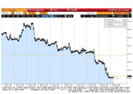 Ayer cerró a 44,05 dólares, y aunque esta mañana repunta hasta los 44,18, durante la tarde ha vuelto a descender de la cota de los 44 dólares. El West Texas ha corrido peor suerte y toca sus mínimos en dos meses. El cobre, por su parte, está cerca de los mínimos desde 2009 que tocó en verano pasado.