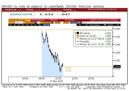En paralelo, y de nuevo anticipando la actuación de Draghi, el bono español a diez años pasó a cotizar al 1,51%, en niveles no vistos desde mayo. La prima de riesgo, pese a que el interés del bono alemán a diez años también había caído, se relajó por su parte hasta los 106 puntos básicos.