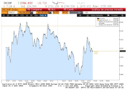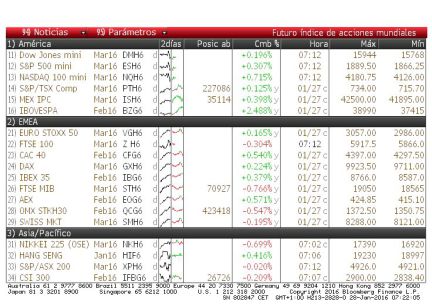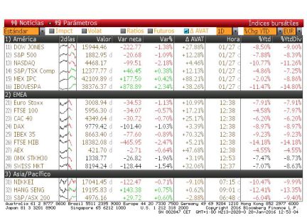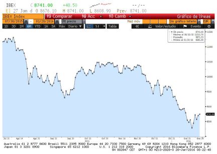 1 Bolsa. La de hoy fue una sesión no apta para cardíacos. El Ibex 35, que abrió a la baja, se mantuvo en negativo la mayor parte de la jornada. Sin embargo, minutos antes de la apertura de Wall Street, los inversores apostaron decididamente por las compras llevando al selectivo a avanzar un 0,5% ante los rumores que apuntaban a la posibilidad de un recorte de la producción de crudo. El desmentido por parte de los países del Golfo provocó que los inversores retomaran la senda bajista que domina en este inicio de año. La Bolsa española concluyó la sesión con un descenso del 1,72%, perdiendo de vista los 8.600 puntos. En el resto de Europa el rojo volvió a ser el color dominante del día. De nuevo, el Mib italiano fue el índice más castigado por el fuerte descenso de la banca, sector con gran peso en el país transalpino. En los últimos días han sido muchos los rumores que apuntaban a un rescate bancario similar al efectuado en España en 2012. Ante las dudas que todavía persisten, el Mib se dejó 3,49%. Por su parte, el Dax alemán cayó un 2,44%; el Cac francés, un 1,33%; el Euro Stoxx, un 2,1% y el Footsie británico perdió un 0,98%.