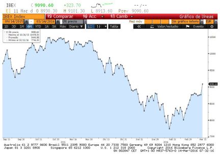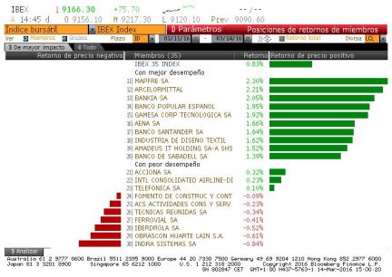 Ante este escenario, el Ibex ha conseguido anotarse un 0,57%, hasta los 9.142,7 puntos. El selectivo ha logrado así afianzar la barrera psicológica de los 9.000 puntos, que había recuperado el pasado viernes, y seguir ganando terreno a sus pérdidas anuales, que se sitúan en más del 4%. A esta mejora dentro del índice han contribuido especialmente Mapfre, que se ha situado en las primeras posiciones del parqué (+2,3%) después de que el pasado viernes presentara su plan estratégico 2016-2018, además de ArcelorMittal (+2,97%), que ha cerrado liderando el selectivo a un día de iniciar su proceso de ampliación de capital. Junto con estas, el sector de la banca también ha ayudado a la escalada del Ibex, aunque a media sesión el impulso de los bancos ha acabado frenándose tras una apertura a la baja en Wall Street.