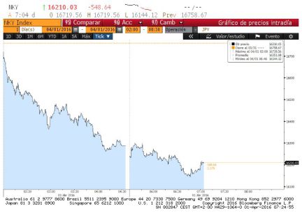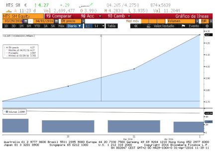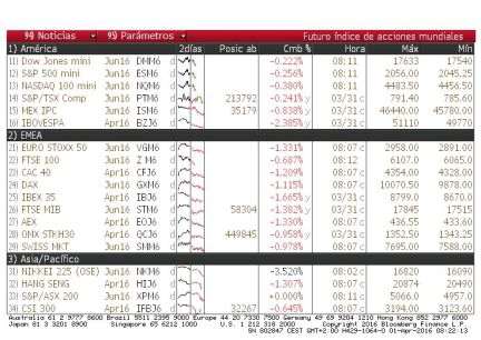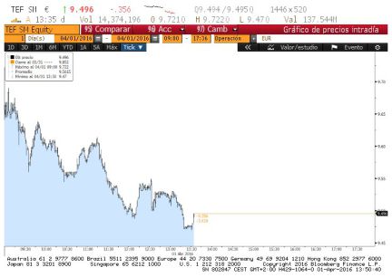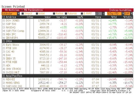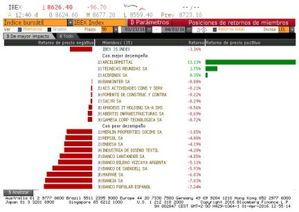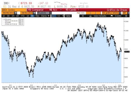 En el mercado español, la semana tampoco ha sido mucho mejor para el Ibex. El selectivo, que retomaba su actividad tras el Lunes de Pascua con leves ganancias, ha acabado sumido en las pérdidas y siendo uno de los principales índices europeos en registrar la mayor caída semanal, al dejarse un 2,1%. Y es que la incertidumbre política sobre la formación del nuevo gobierno y el mal dato de déficit con el que cerró España en 2015, superando el límite exigido por Bruselas, que se situaba en el 4,2%(frente al 5,16% registrado), han sido algunos de los lastres que ha acusado el Ibex, que se han sumado a la corrección de la banca, al ascenso del euro y a los vaivenes del crudo. Con todo, el selectivo ha cerrado hoy con un retroceso del 1,38%, hasta los 8.602,3 puntos. Al frente de las pérdidas ha destacado Telefónica (-3,87%), que se ha alejado de los 10 euros por acción que había alcanzado el pasado martes tras anunciar el relevo en su presidencia. La compañía, con la que el mercado mantiene dudas acerca del conjunto de su dividendo, ha vuelto así a cotizar a los niveles previos al anuncio. Al otro lado se ha situado ArcelorMittal (+4,5%), que también se ha posicionado como el valor con mejor desempeño en el conjunto de la semana y del trimestre. La siderúrgica, que durante los dos primeros meses se había visto golpeada por el descenso en el precio del crudo, ha conseguido hacer frente a su declive y aprovechar las últimas subidas en el mercado de materias primas, que le han llevado a remontar más de un 30% en los tres primeros meses.