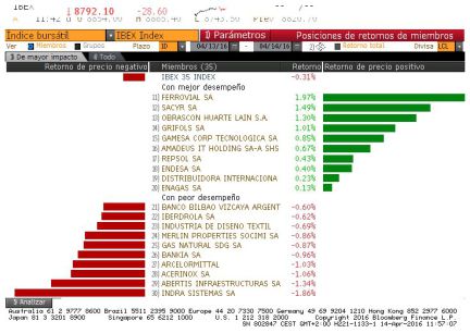 Ante este escenario, el selectivo español ha conseguido anotarse una subida del 0,46%, hasta los 8.861,5 puntos, lo que le ha permitido mantener los 8.800 que recuperó ayer en su mejor sesión en el último mes. Y es que, después de haber estado sumergido en las pérdidas durante gran parte de la jornada, el Ibex ha logrado escalar gracias a valores como Ferrovial (+3,84%) o Gamesa (+1,36%), que estuvieron apoyados, además, por el impulso de la banca. En el lado opuesto, los protagonistas han sido las compañías ligadas al sector de las materias primas, uno de los que más se ha revalorizado en las últimas semanas gracias al ascenso del crudo. Así, Técnicas Reunidas (-1,11%) o Acerinox (-1,2%) han acabado siendo los farolillos rojos del índice español, junto con Abertis (-1,78%) debido a una rebaja en su recomendación.