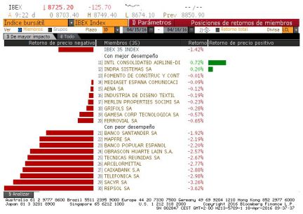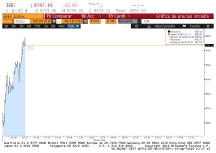 El Ibex 35 reduce las pérdidas. El selectivo se deja a esta hora un 0,64% y se sitúa de nuevo al filo de los 8.800 puntos tras perder en la apertura un 1,6% como reacción inicial a la falta de acuerdo en Doha.