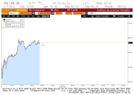 El petróleo se desploma. Tras el fracaso de la negociación, el barril de Brent baja esta mañana un 4% hasta rozar los 41 dólares, después de las subidas acumulads en los dos últimos días. Gráfico: caída en el día del Brent (Bloomberg)