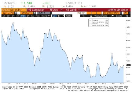 La deuda, estable. La rentabilidad del bono español a 10 años sube al 1,5% (desde el 1,49% del viernes). La prima de riesgo sube a 139 puntos básicos, dos puntos más que el último cierre. Gráfico: rentabilidad del bono a 10 años desde enero