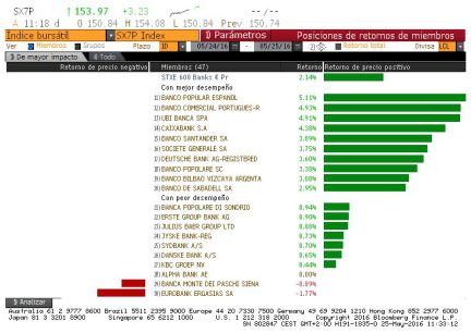 Fuerte tirón de la banca. En los ascensos registrados en esta sesión el sector bancario fue uno de los grandes protagonistas.El índice europeo que engloba a las entidades lideró las subidas en el Viejo Continente tras anotarse un 3,29%. En estas subidas las firmas españolas ocuparon un lugar destacado. Banco Popular yCaixaBank, consiguen recuperar parte del terreno perdido en el año, y repuntaron un 7,53% y 6,27%, respectivamente. Les siguieron los dos colosos del sistema financiero,Santander y BBVA, que registraron alzas del 6%, en el caso de la entidad que preside Ana Botín, y un 5,27% para la entidad que encabeza Francisco González.En el plano europeo, además de las españolas destacaron las italianas comoBanco Popolare (8,73%), Banca Popolare di Milano (8,27%), o Ubi Banca (7,22%).