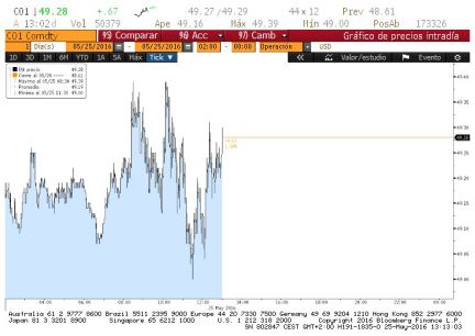 Oro negro y mercado de divisas. El petróleo continúa su tendencia alcista. Al cierre de los mercados europeos el barril de Brent registraba un ascenso del 1%. Desde el 9 de mayo, el oro negro se encuentra en pleno rally y sube un 12%, hasta los 49 dólares, su máximo anual. Desde los mínimos de enero, el Brent acumula una revalorización 76,6%.