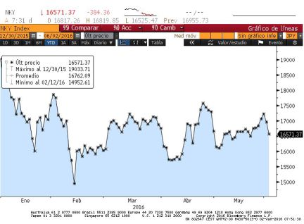 Japón. El índice Nikkei de la Bolsa de Tokio cerró hoy con una caída de 393,18 puntos, un 2,32%. La fortaleza del yen provoca su mayor retroceso en un mes