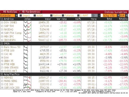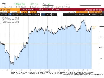 La Bolsa española ha subido hoy un 1,27%, hasta los 8.587,2 puntos de la mano de los bancos que han presentado resultados. En la semana, ha caído un 0,1%, pero se ha disparado un 5,19% en julio. Es su mejor marca mensual desde octubre del año pasado.