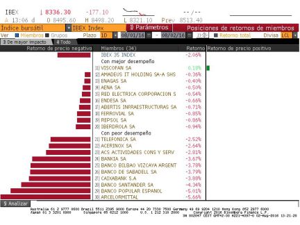 El Ibex sufre un ataque bajista en el inicio de agosto. En las dos sesiones del mes se ha dejado un 3,6%, después de perder hoy un 2,77%, lo que le ha hecho cerrar en los 8.277,30 puntos. Los culpables han sido, un día más, los bancos. Los seis examinados por la EBA, y pese a que sacaron excelentes notas el viernes, sufren lo indecible.