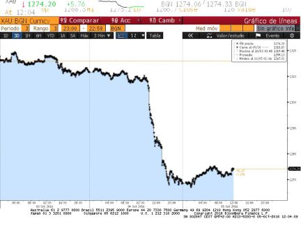 Oro. El fortalecimiento del dólar ayer provocó una ola de ventas en el oro, que perdió más de un 3% hasta situarse por debajo del nivel de los 1.300 dólares la onza por primera vez desde junio. "En el contexto de retroceso de riesgos para el crecimiento y un dólar estadounidense más fuerte, mantenemos una visión cautelosa sobre el oro", sostienen los expertos del banco privado suizo Julius Baer. El metal precioso recupera hoy en torno a medio punto porcentual. En el siguiente GRÁFICO se aprecia la evolución del oro en los últimos tres días.