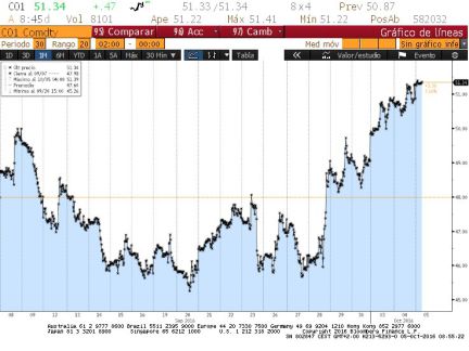 En el ámbito de las materias primas el brent aceleró las subidas tras los inventarios de crudo en EEUU que bajaron en 2,9 millones de barriles frente al alza del millón previsto. Esto ayudó al crudo a prolongar la tendencia alcista que arrastra desde que la semana pasada se conociera que los miembros de la OPEP habrían llegado a un acuerdo para recortar la producción.Al cierre de los mercados europeos el Brent avanzaba más de un 2% y recuperaba los 52 dólares por barril.