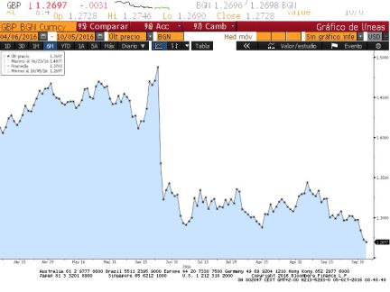 La libra profundiza los mínimos. La libra retrocede hoy un 0,26% y cae por debajo de los 1,27 dólares, en zona de mínimos de 30 años. También cae frente a la moneda europea, un 0,34%, hasta 1,13 euros. Gráfico: libra/dólar en los últimos 6 meses