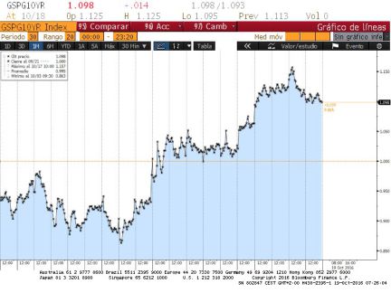 Deuda. La rentabilidad del bono a diez años (en la imagen) escala posiciones levemente hasta el 1,104%, lo que deja la prima de riesgo en 106 puntos básicos.