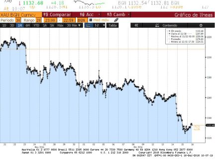 El oro, por su parte, tradicional activo refugio del mercado ante la volatilidad y la incertidumbre refleja tranquilidad entre los inversores marcando mínimos desde hace meses en los 1.128 dólares por onza.