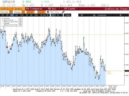 El efecto se ha ido haciendo notar en la cotización de la deuda. La rentabilidad del bono español a 10 años sube levemente este viernes hasta el 1,441%, lejos ya del 0,8% que marcó en octubre, con la prima de riesgo del país en el entorno de 110 puntos básicos.