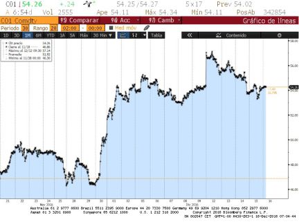 El barril de crudo Brent para entrega en febrero abrió hoy al alza en el mercado de futuros de Londres hasta los 54,26 dólares, un ascenso del 0,44% respecto al cierre de la jornada anterior.