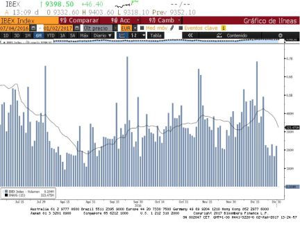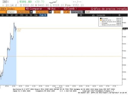 Una primera sesión del año anodina. Con las Bolsa de Nueva York, Londres, Tokio y Shanghai cerradas por festivo, el resto de índices del Viejo Continente han iniciado 2017 en positivo. El Ibex, que en los primeros compases llegó a caer levemente, se recuperó pasados unos minutos y concluye la primera jornada del nuevo ejercicio con un avance del 0,71% que le lleva a recuperar los 9.400 puntos. Sin embargo, lo más llamativo de la jornada no han sido los ascensos sino el bajo volumen de negociación. La Bolsa española ha movido hoy 802 millones, un 64% menos que la media del mes de diciembre (2.229 millones).
