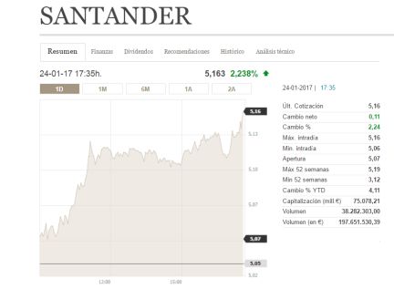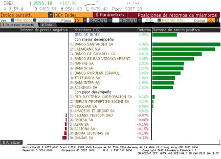En España, el pistoletazo de salida de los resultados de las entidades financieras, con el anuncio de Santander de un beneficio atribuido de 6.204 millones, ha hecho subir al Ibex 35. El índice ha vuelto al terreno positivo en 2017 al cerrar este miércoles con una subida del 1,73%, en su mejor sesión en lo que va de año, ya que no se veía un alza parecida desde el 8 de diciembre. El selectivo español ha cerrado en 9.549,30 puntos, un nivel que no marcaba desde diciembre de 2015.