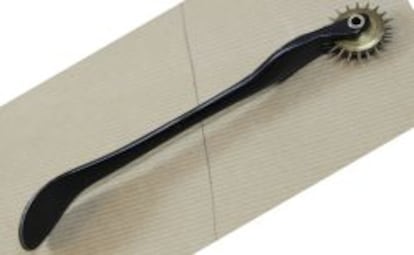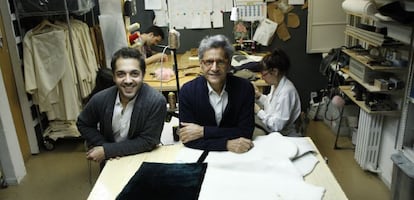 Las prendas y accesorios, porque la casa también confecciona bolsos, guantes y otros complementos, nacen en la trastienda, donde las telas, pieles, patrones de tallaje y medidas, ocupan las paredes. En las mesas, donde trabajan costureros y modistas, lucen varias máquinas de coser y herramientas para trabajar la tela y la piel. Una de las piezas preferidas por padre e hijo es un viejo rodillo para marcar y calcar patrones, un artilugio que reproduce la misma medida en dos piezas diferentes. “Tiene 40 años y fue el primero del taller. Aunque ya no suelen utilizarse estas herramientas, nosotros en el trabajo de la última colección sí recurrimos a ella”, cuenta.