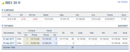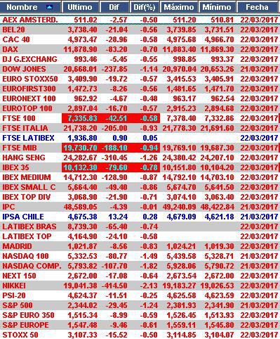 Donde no se dejó sentir lo acontecido en Londres fue en la renta variable. Aquí los inversores tienen la mirada puesta en EE UU. Este jueves el presidente Donald Trump llevará su reforma sanitaria al Congreso. Aunque la Cámara de Representantes y el Senado estadounidense están en manos de los republicanos, día a día crecen las dudas sobre la posibilidad de sacar adelante su programa económico. Después de las fuertes caídas registradas el martes en Wall Street, las Bolsas europeas amanecieron en negativo. El Ibex no fue una excepción. El selectivo inició la jornada con pérdidas, pero al cierre consiguió mejorar el tono y concluyó con un ascenso del 0,17%, hasta los 10.229,30 puntos. Con esta subida, y a pesar de las correcciones de los últimos días, el selectivo continúa anclado en zona de máximos.