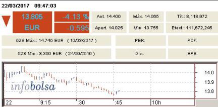 El Ibex, el índice menos penalizado de Europa. Hoy toca recogida de beneficios. El Ibex cede alrededor de medio punto porcentual, siendo el índice menos bajista de Europa. Los mayores recortes se registran en la Bolsa de Londres, que cede un 0,84%, mientras que el Dax de Francfort y el Cac de París, encajan respectivos recortes del 0,64% y 0,63%.