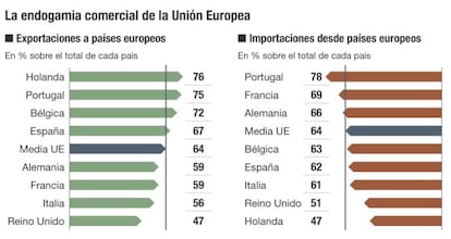 En ese contexto, las empresas exportadoras han optado por buscar acomodo en mercados conocidos. Los últimos datos de Eurostat reflejan que el 64% de las exportaciones europeas tuvieron como destino otro país de ese continente y que el 64% de las importaciones procedieron de otro socio comunitario en 2016. Supone una décima más que el porcentaje registrado en los dos ejercicios anteriores y corrobora el fracaso de ese proceso de diversificación. Entre los ocho grandes países vendedores de bienes en Europa (Alemania, Holanda, Francia, Reino Unido, Italia, Bélgica, España y Polonia) solo hay cuatro que tienen un país de fuera de la UE entre sus tres principales compradores de bienes (Alemania, Francia, Italia y Reino Unido). EE UU es el mayor comprador de bienes de Reino Unido, con un 15% del total, y de Alemania, con un 9% del total, mientras que baja a la tercera posición en el caso de Italia (9% de las exportaciones) y Francia (7%). En los restantes cuatro, todos los grandes proveedores son europeos. Ningún país asiático ni suramericano aparece entre los tres mayores compradores de bienes de la UE.