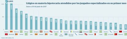 Así lo estiman al menos en el Consejo General del Poder Judicial (CGPJ) al analizar el primer mes de funcionamiento de los juzgados especializados en materia hipotecaria que se han constituido para tratar de evitar que la escalada de litigación crediticia acabara por colapsar la justicia española. En solo 30 días, estas nuevas sedes han registrado 15.800 nuevas demandas coincidiendo con el fin de la primera tanda de negociación extrajudicial de devolución de cláusulas suelo opacas. Un frente que se ha acrecentado desde que, el pasado 21 de diciembre, la Corte de Luxemburgo decretara que la banca debe devolver con retroactividad total lo cobrado por cláusulas suelo opacas. Pero estas distan de ser el único problema de los contratos hipotecarios en España. El servicio de reclamaciones del Banco de España ha advertido que en el primer trimestre de 2017 las quejas de la clientela se han disparado fundamentalmente en relación a las cláusulas que les imponen el pago de todos los gastos de constitución de la hipoteca, articulado que el Tribunal Supremo consideró nulo en diciembre de 2015. De otra parte, el alto tribunal español ha decidido consultar a la justicia europea sobre las cláusulas de vencimiento anticipado, las que permiten a las entidades iniciar la ejecución de las garantías de un préstamo, o los intereses de demora, y cómo proceder tras su anulación.