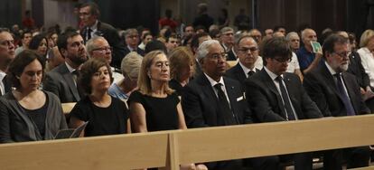 Los Reyes, Felipe VI y Letizia; el presidente del Gobierno, Mariano Rajoy; el de la Generalitat, Carles Puigdemont, y la alcaldesa de Barcelona, Ada Colau, son algunas de las autoridades que han asistido esta mañana a la misa por la paz y en memoria de las víctimas de los atentados en Barcelona y Cambrils (Tarragona) en la Sagrada Familia.